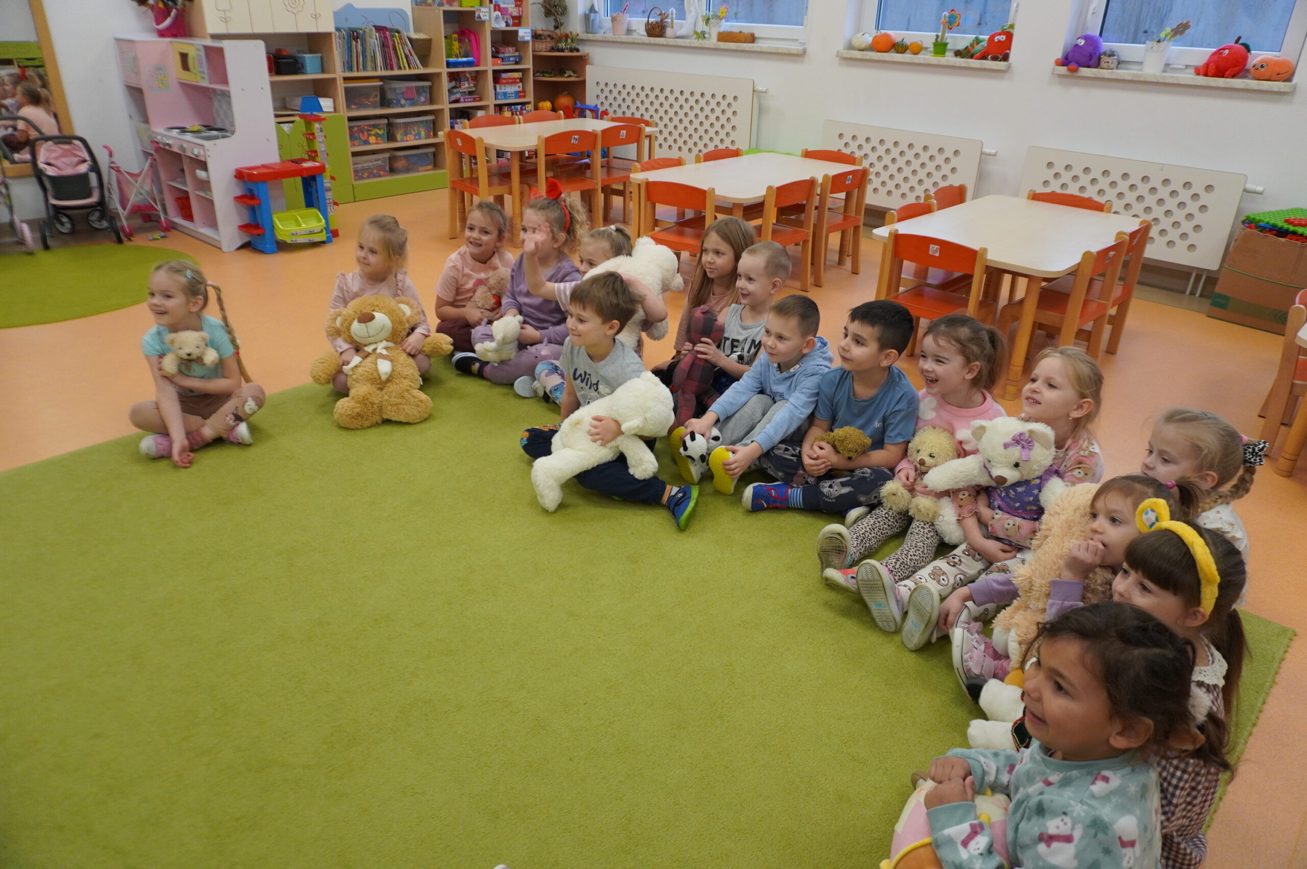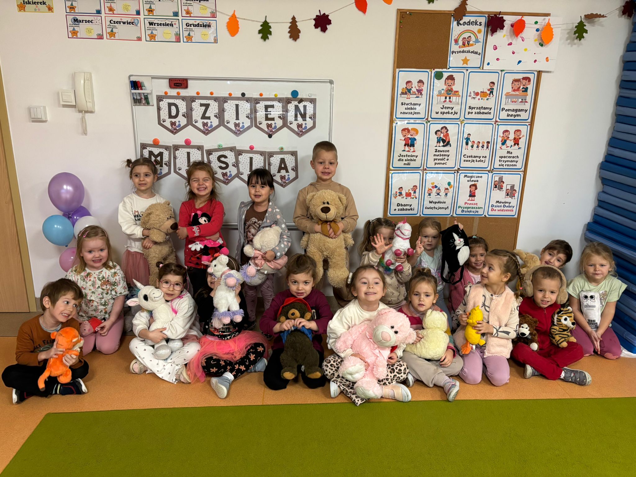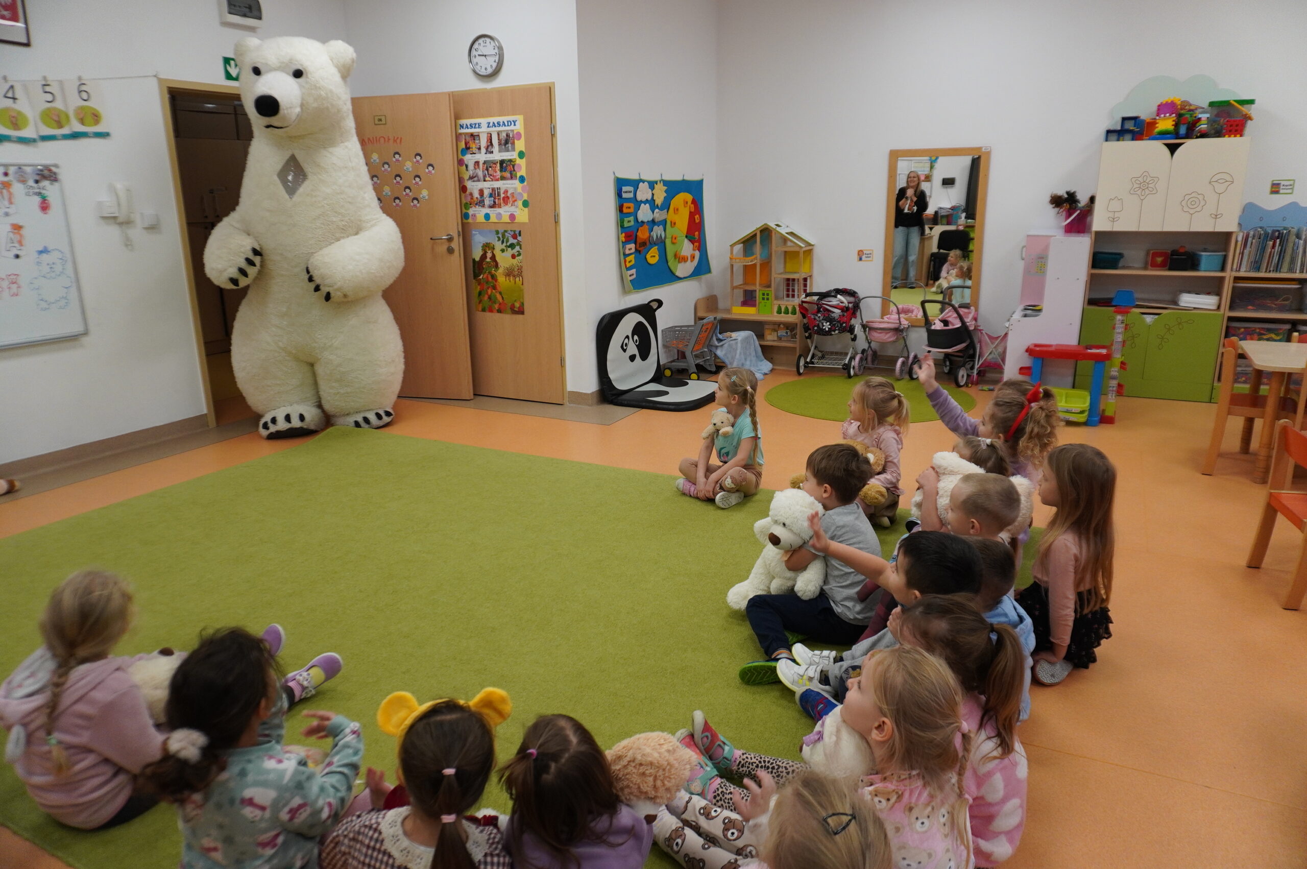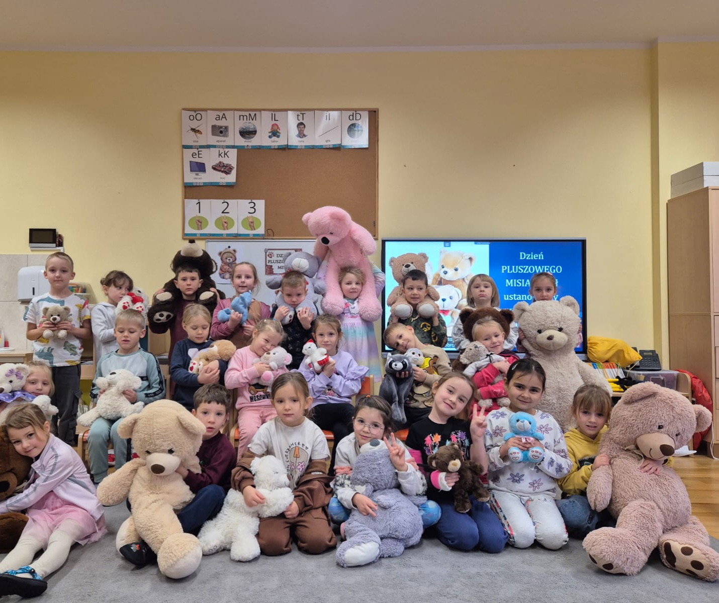 Światowy Dzień Pluszowego Misia obchodzi się 25 listopada i jest to święto poświęcone najukochańszej zabawce wszystkich dzieci, która często jest pierwszym przyjacielem oraz dodaje odwagi w wielu sytuacjach. W naszym przedszkolu w tym dniu pojawiło się mnóstwo pięknych misiów oraz ten jeden największy, który zachęcił dzieci do wspólnej tanecznej zabawy. Iskierki i Aniołki na tę okazje upiekły wraz z paniami misiowe ciasteczka, które ze smakiem zjedli. To był naprawdę „misiowy” dzień.