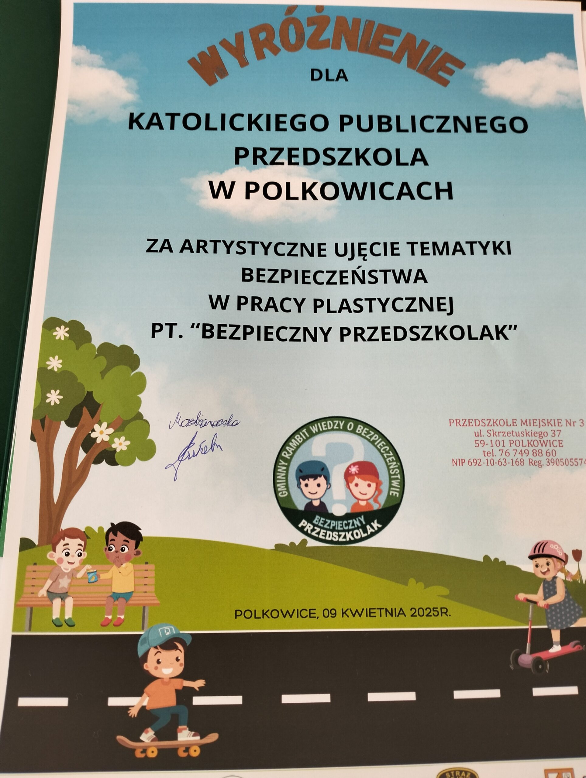 Wiedzą z zakresu szeroko rozumianego bezpieczeństwa wykazały się nasze starszaki w 3-osobowym składzie, reprezentując nasze przedszkole w III EDYCJI GMINNEGO RAMBITU O BEZPIECZEŃSTWIE „BEZPIECZNY PRZEDSZKOLAK”. Przedszkolaki zmierzyły się z 8 oddziałami zerówkowymi zajmując III miejsce. Odważnie i z pewnością siebie przechodziły kolejne stacje, rozwiązując zadania praktyczne oraz teoretyczne, tym samym stanęli na podium wygrywając wspaniałe nagrody dla siebie oraz całej grupy. Jednocześnie gratulujemy grupie Owieczki wyróżnienia za plakat o bezpieczeństwie. Gratulujemy także wszystkim drużynom, które tak wspaniale reprezentowały swoje placówki. Życzymy dalszych sukcesów.