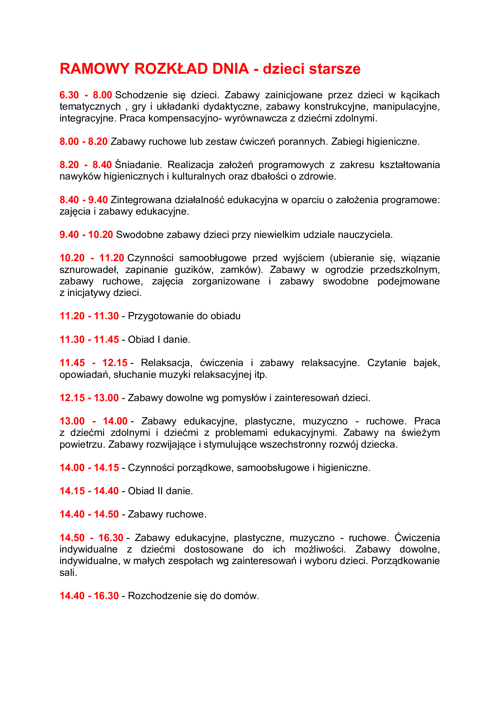 Pobyt dziecka w naszym przedszkolu planowany jest w oparciu o ramowy rozkład dnia, który jest wzbogacany i modyfikowany w zależności od dyspozycji dzieci, ich samopoczucia i nastroju oraz zaplanowanych działań, np. wycieczek, uroczystości itp.