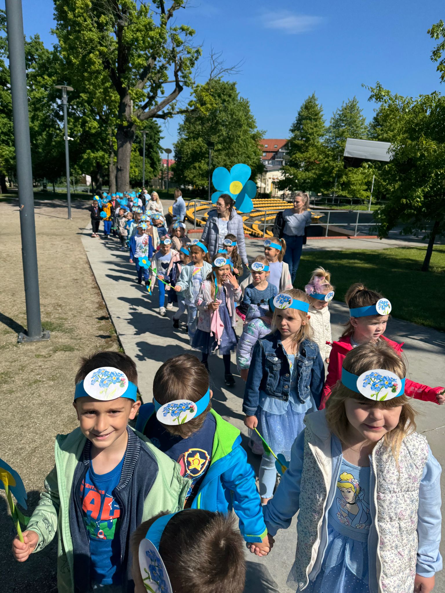 Dzień Polskiej Niezapominajki to święto przyrody, które ma na celu promowanie walorów przyrodniczych, a także stałe przypominanie o ochronie środowiska. Dzieci z naszego przedszkola trzymając w rękach niebieskie kwiaty, wraz z innymi przedszkolami i szkołami podstawowymi przeszły ulicami miasta w stronę ratusza, gdzie spotkały się z burmistrzem Polkowic. Na zakończenie dzieci otrzymały jabłka, które były symbolem promowania zdrowego stylu życia i dbania o środowisko.