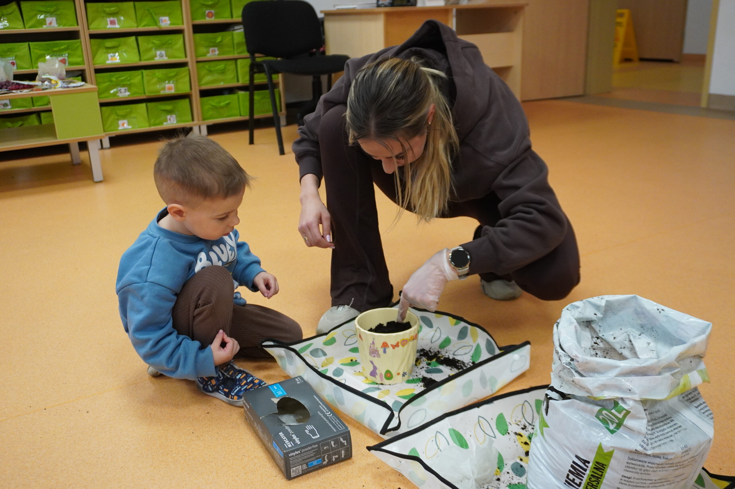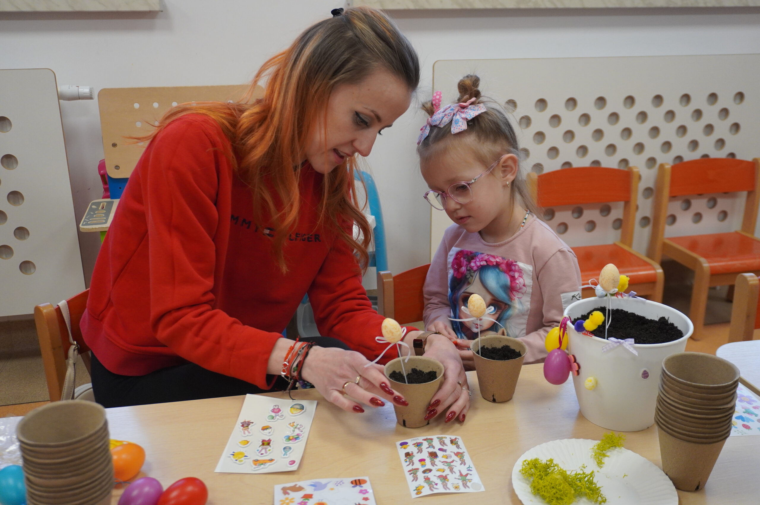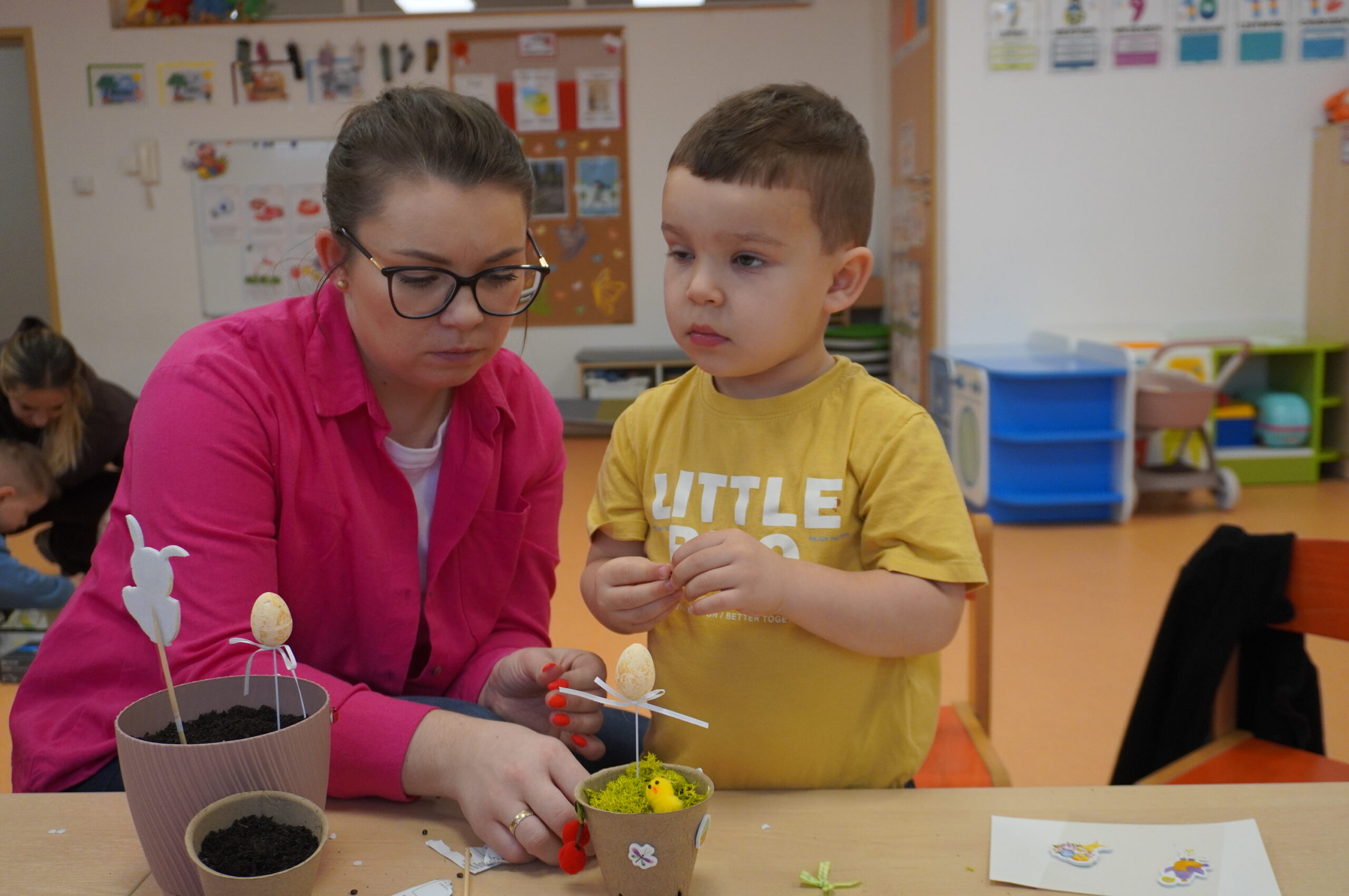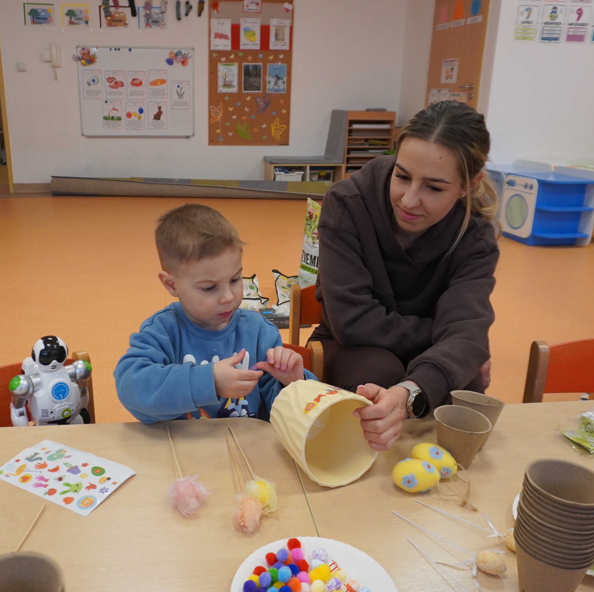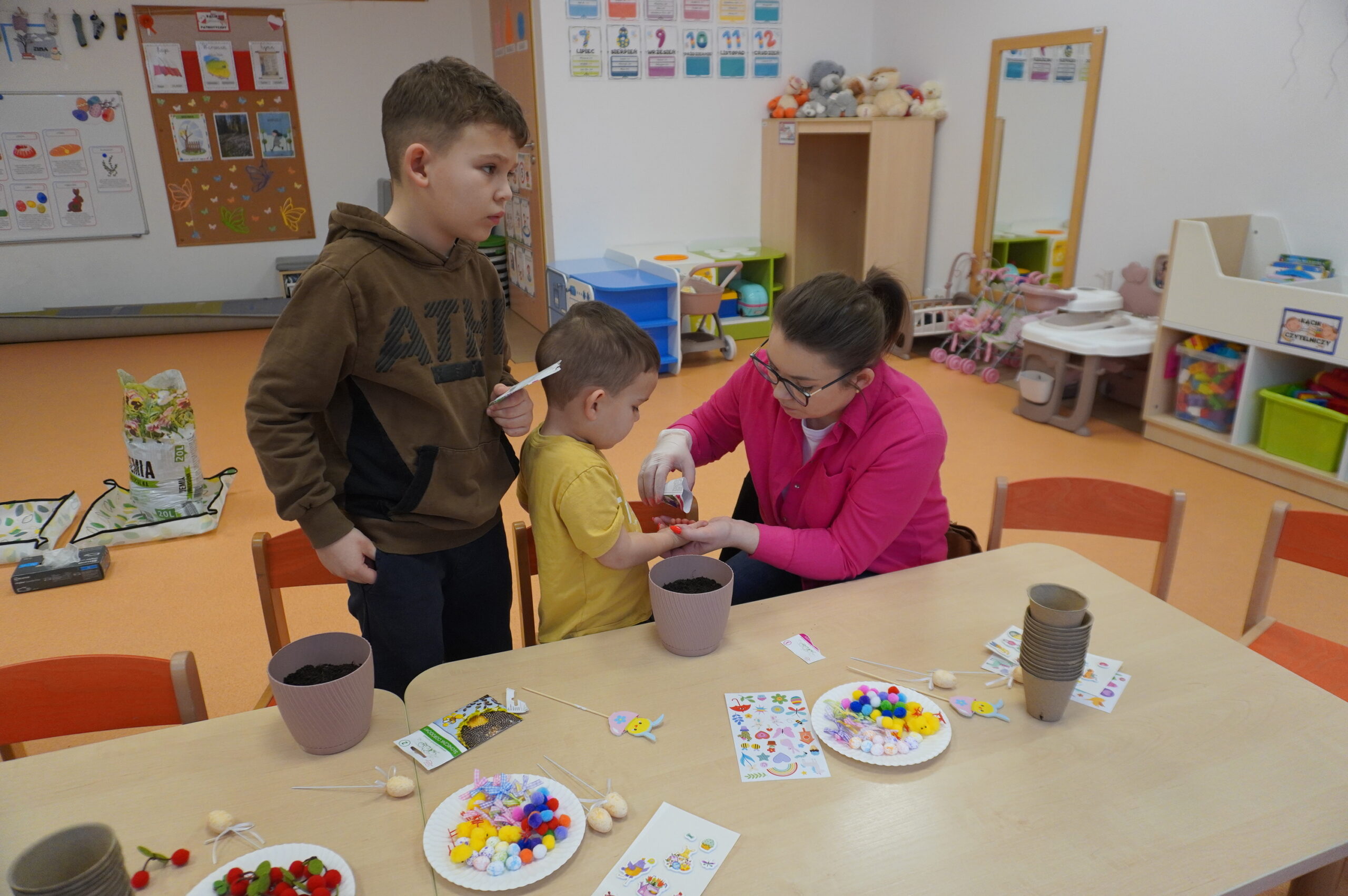 W naszym przedszkolu odbyły się pełne radości i kreatywności warsztaty wielkanocne, podczas których dzieci wraz z rodzicami dekorowały własne doniczki, a następnie sadziły w nich cebulki, warzywa i wiosenne rośliny. Wspólna praca sprawiła wszystkim wiele satysfakcji, a dzieci z dumą zabrały swoje małe ogródki do domu. Dziękujemy rodzicom za obecność, zaangażowanie i ciepłą atmosferę!