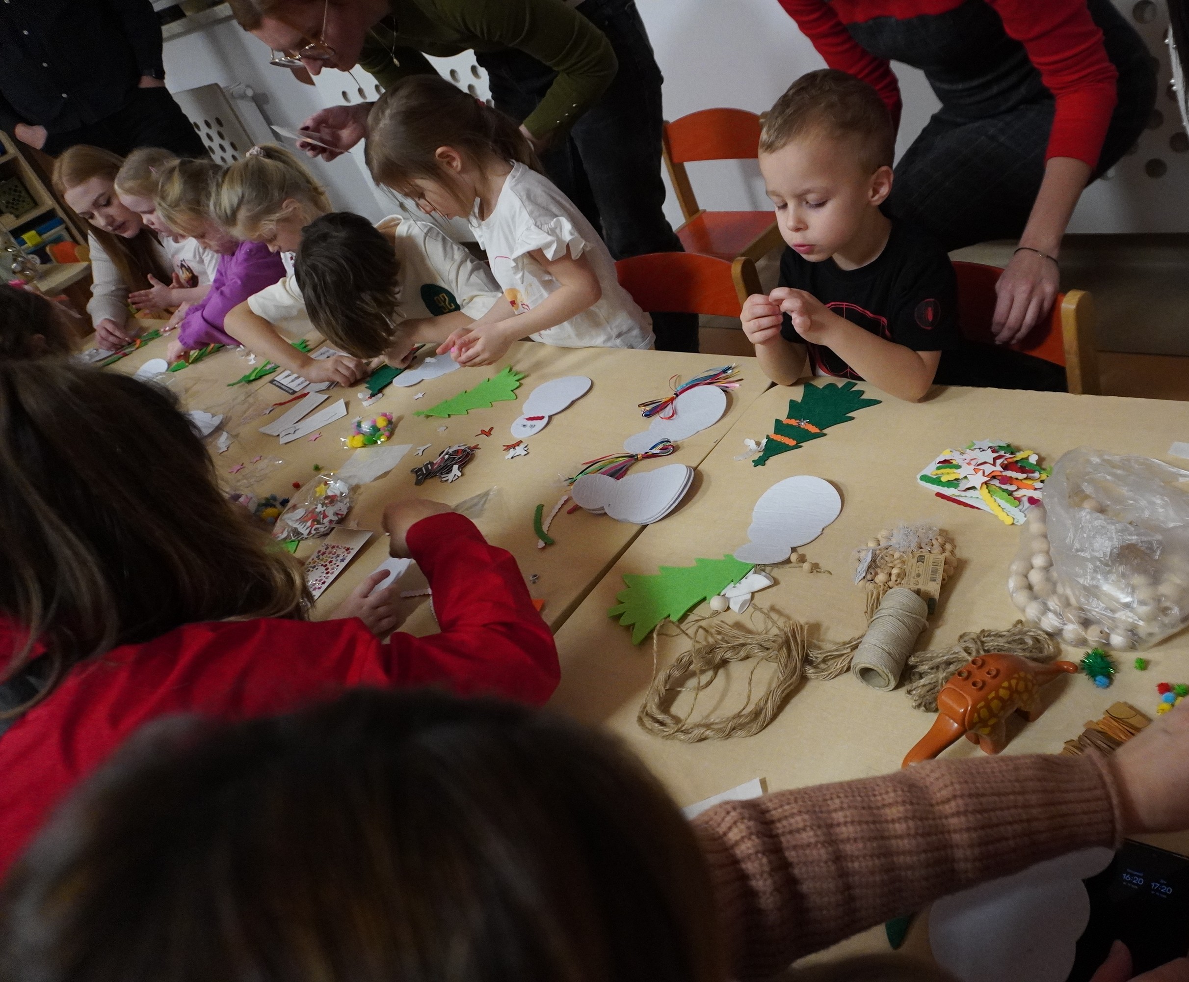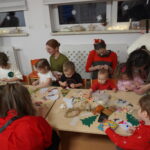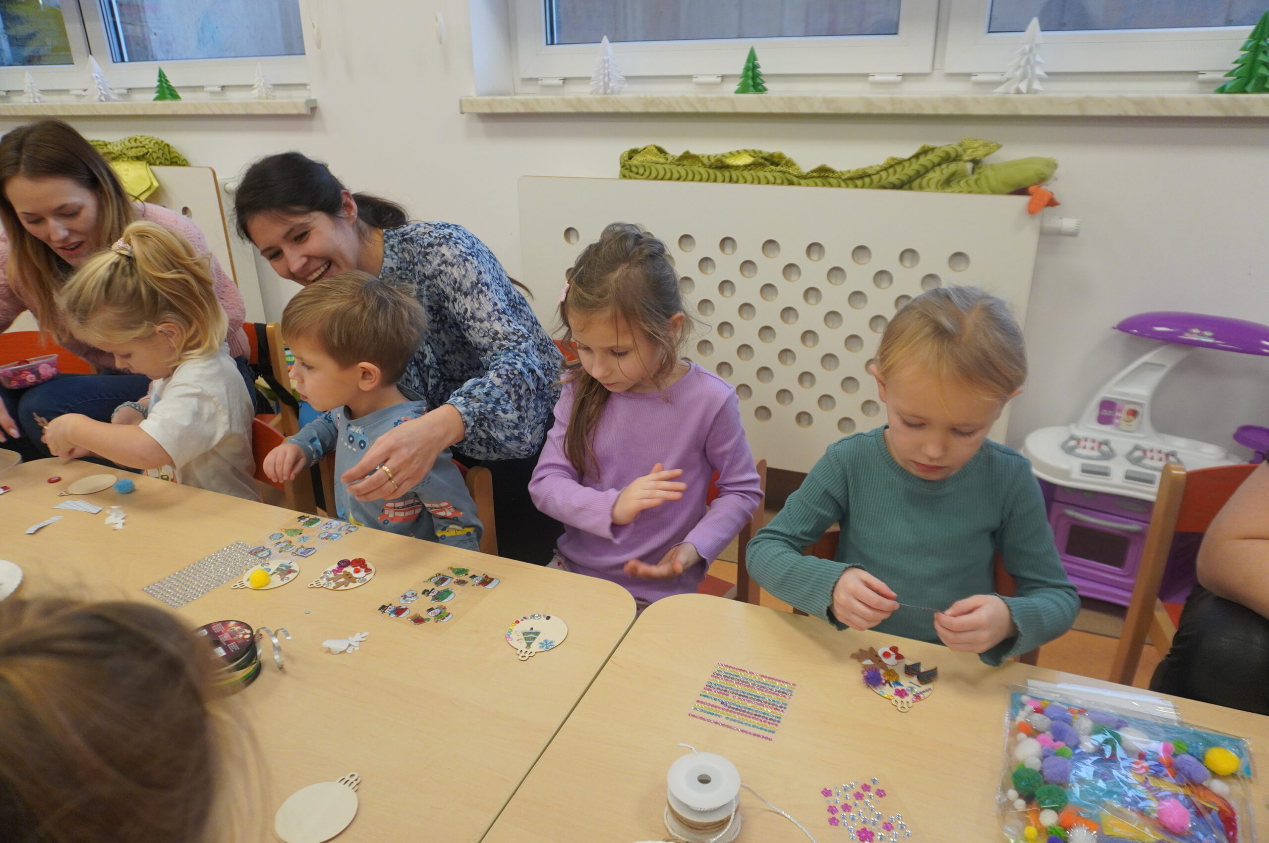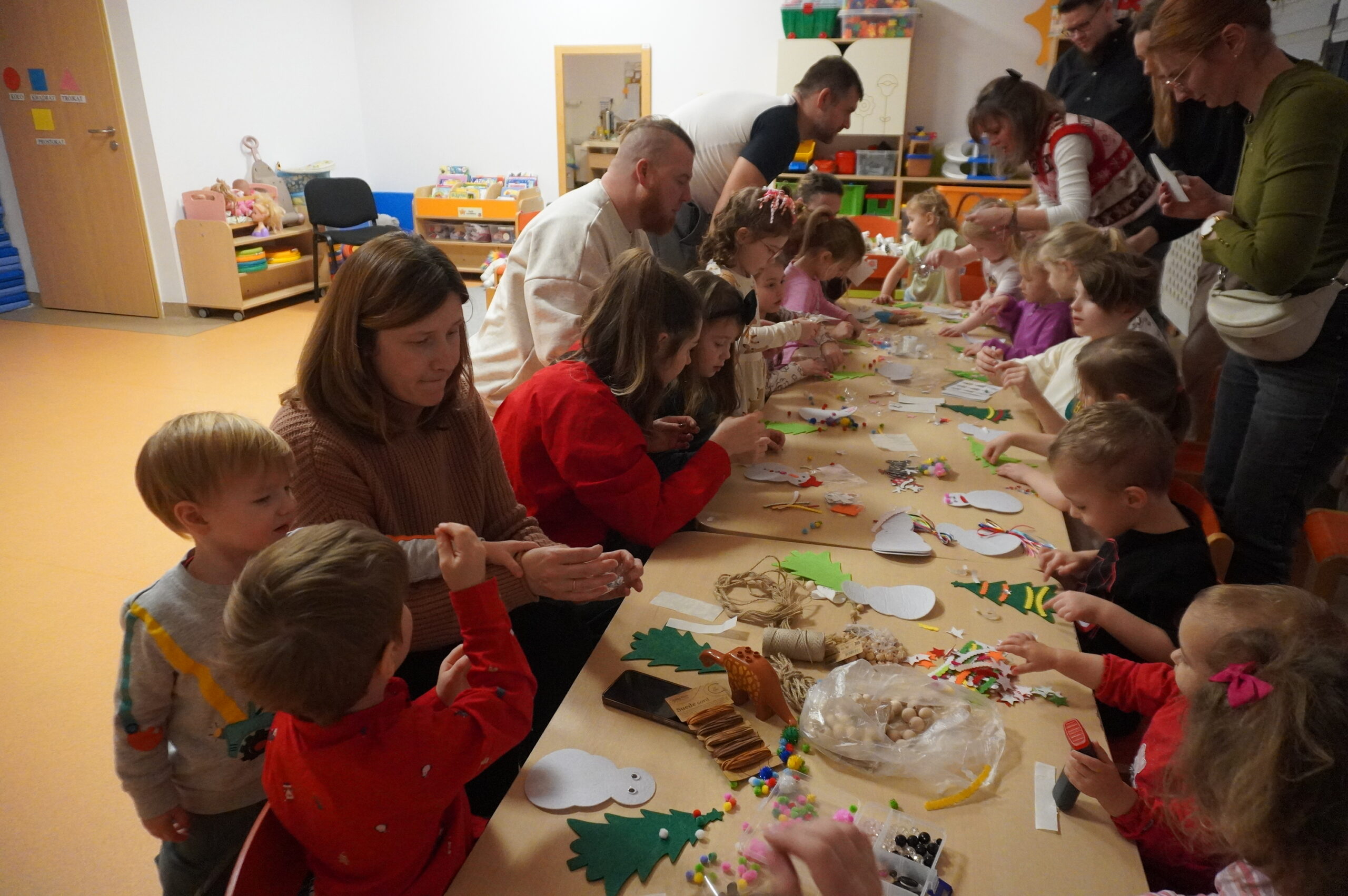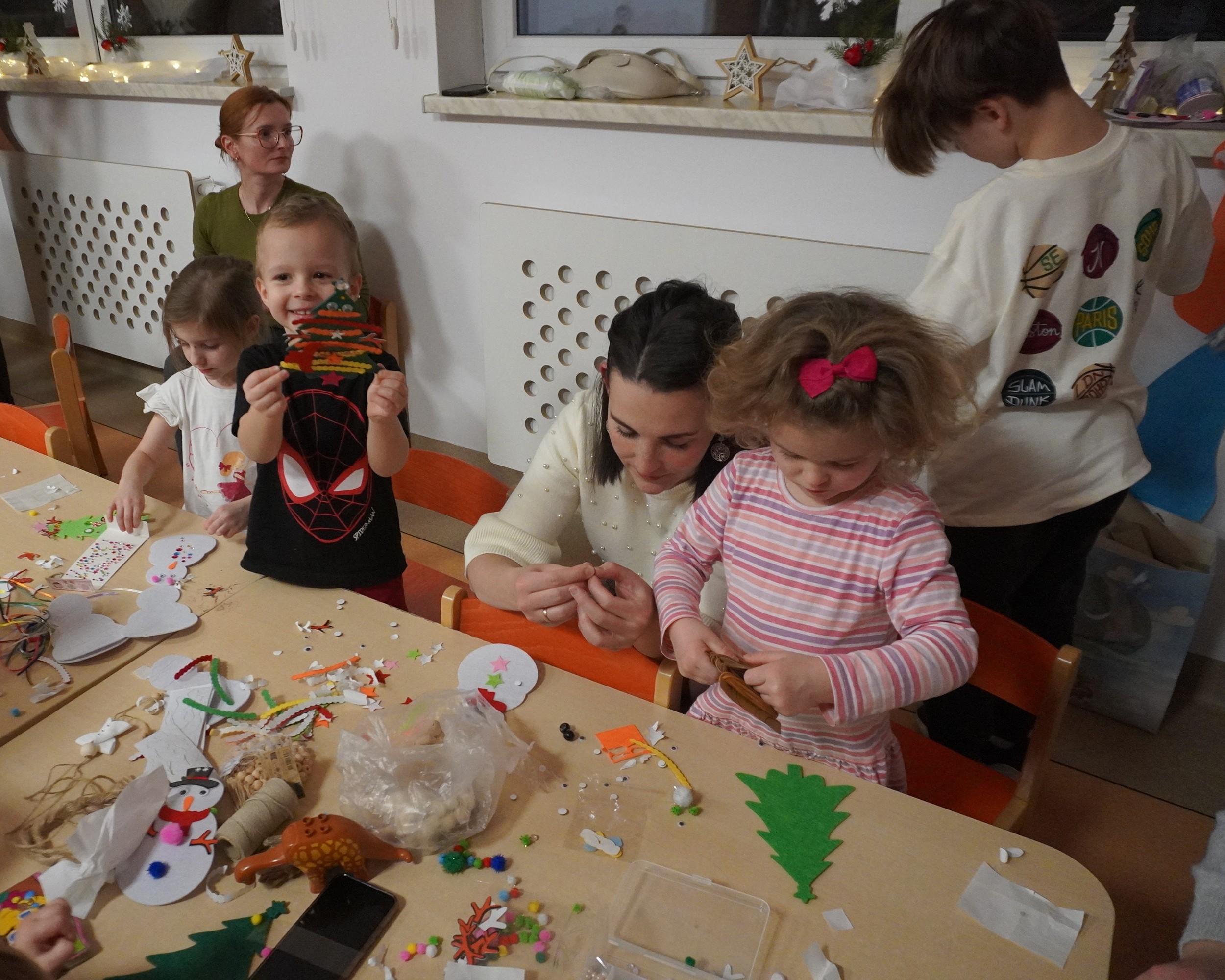 W grupach Owieczki oraz Iskierki odbyły się radosne warsztaty świąteczne z udziałem rodziców. Owieczki wspólnie z bliskimi tworzyły i ozdabiały drewniane bombki, wykorzystując różnorodne materiały dekoracyjne. Natomiast Iskierki rozpoczęły warsztaty krótkim występem artystycznym i również wykonały piękne ozdoby na choinkę. Na zakończenie wszyscy razem ubrali choinkę w sali, tworząc wyjątkową, świąteczną atmosferę pełną ciepła i radości.