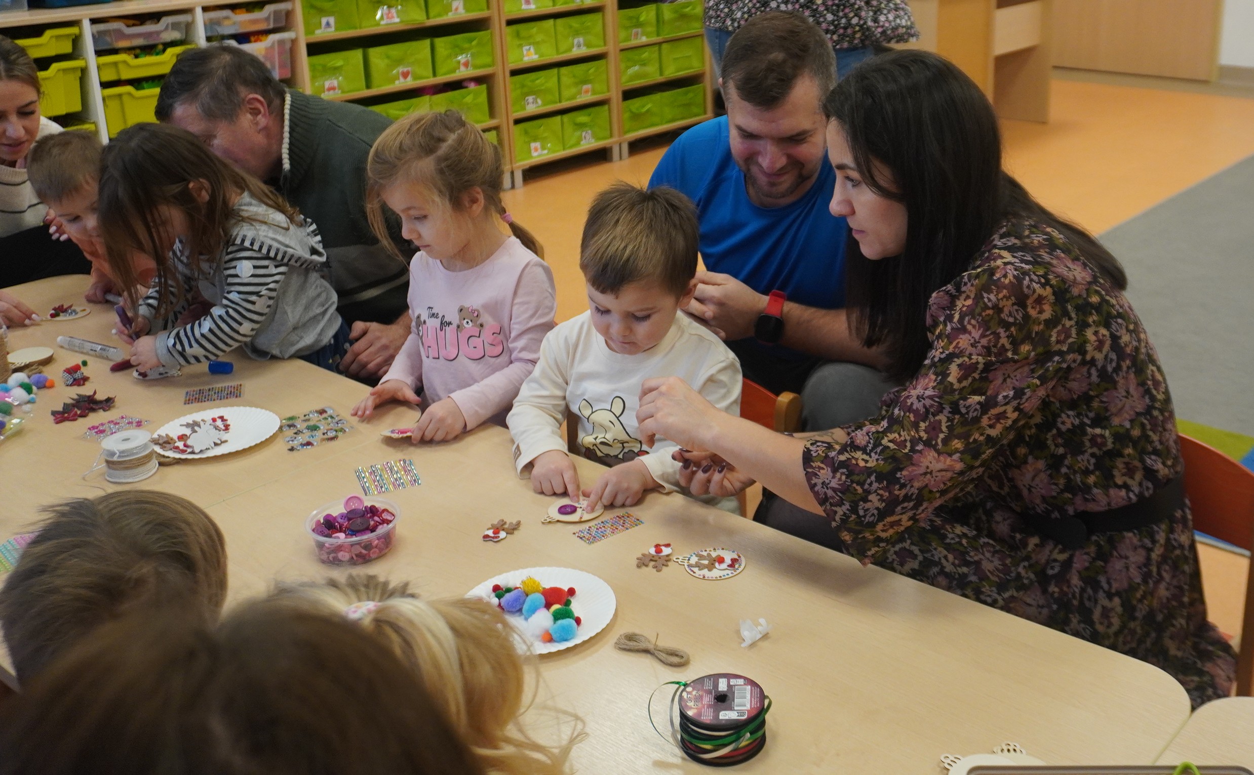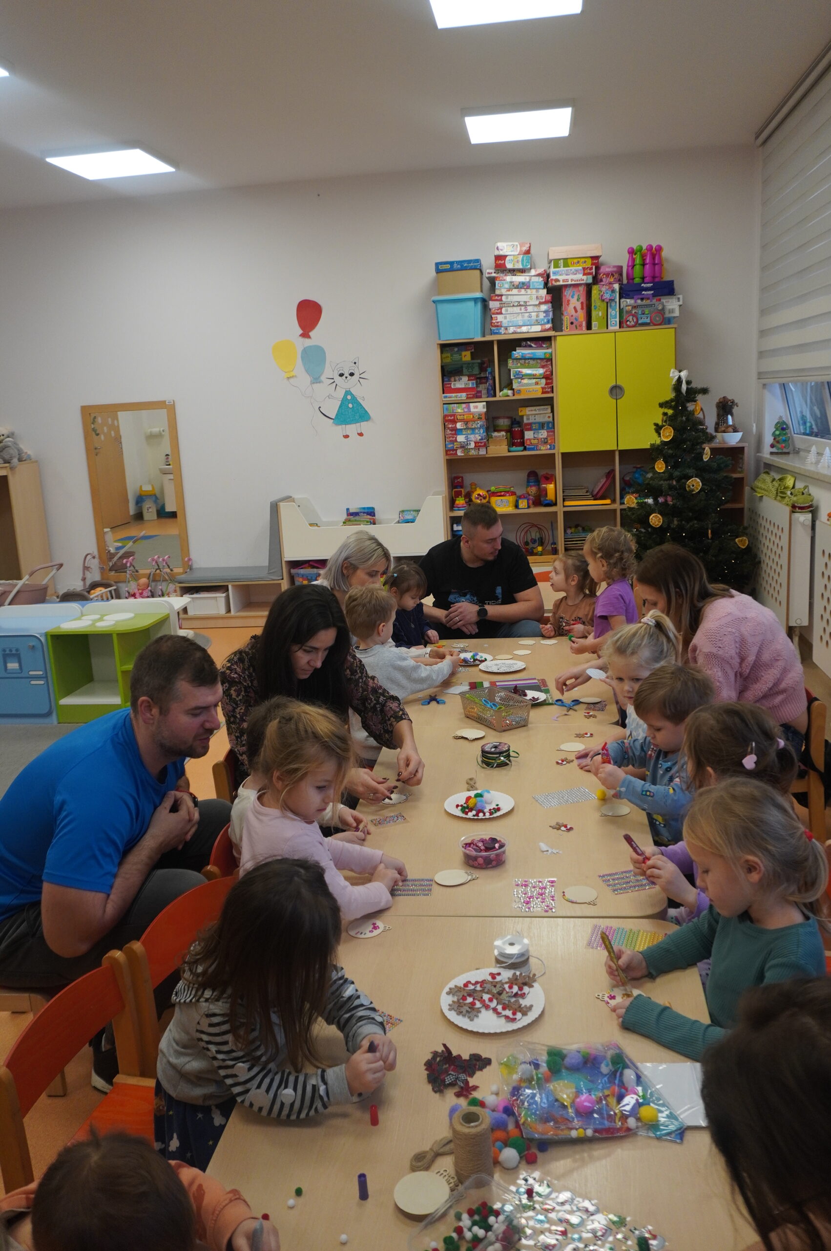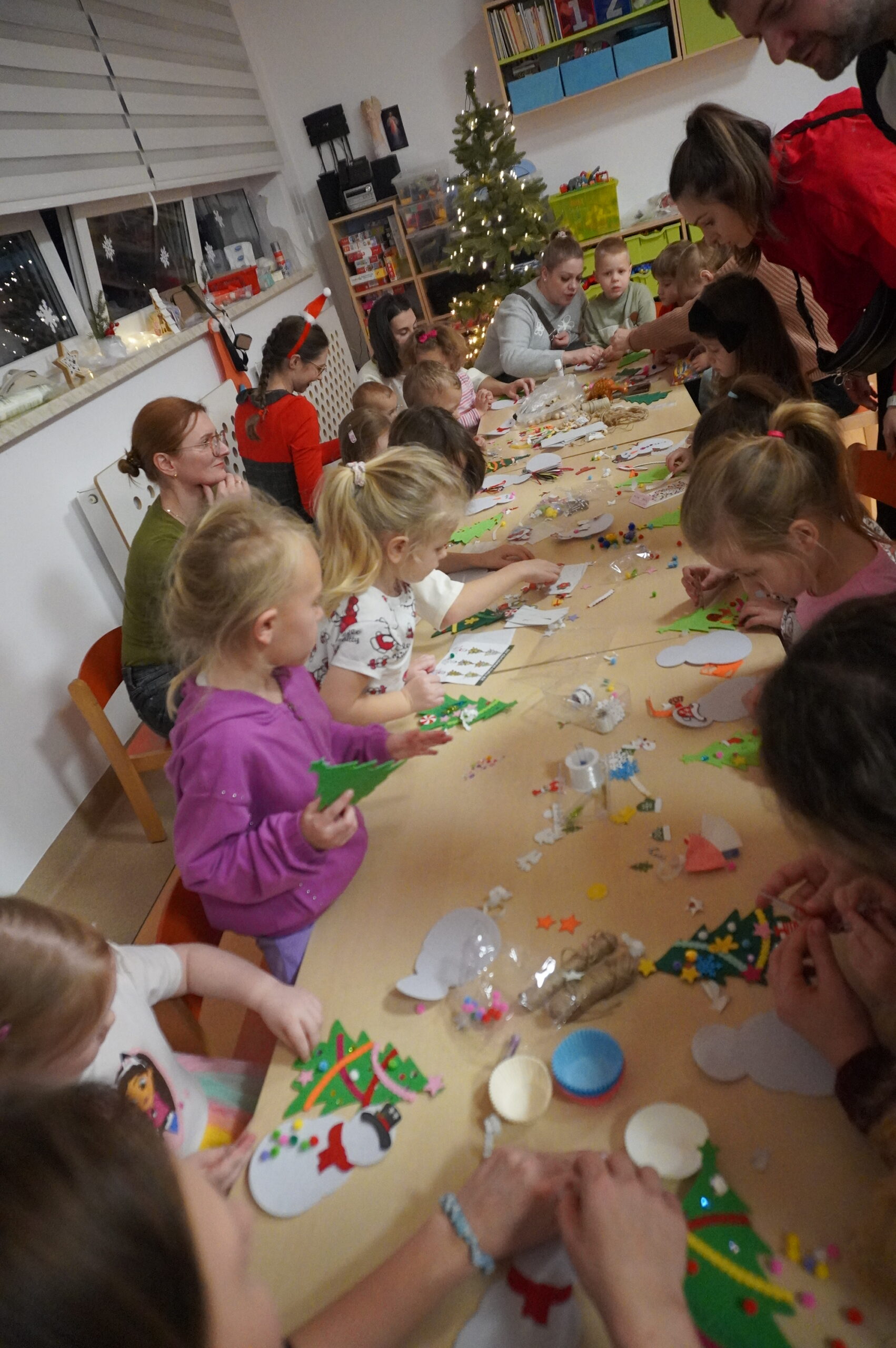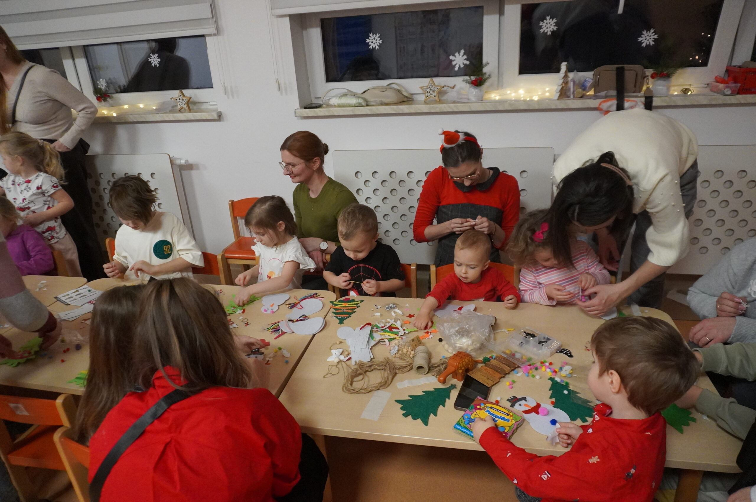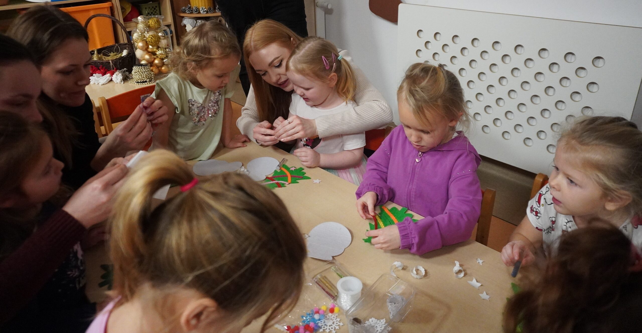 W grupach Owieczki oraz Iskierki odbyły się radosne warsztaty świąteczne z udziałem rodziców. Owieczki wspólnie z bliskimi tworzyły i ozdabiały drewniane bombki, wykorzystując różnorodne materiały dekoracyjne. Natomiast Iskierki rozpoczęły warsztaty krótkim występem artystycznym i również wykonały piękne ozdoby na choinkę. Na zakończenie wszyscy razem ubrali choinkę w sali, tworząc wyjątkową, świąteczną atmosferę pełną ciepła i radości.