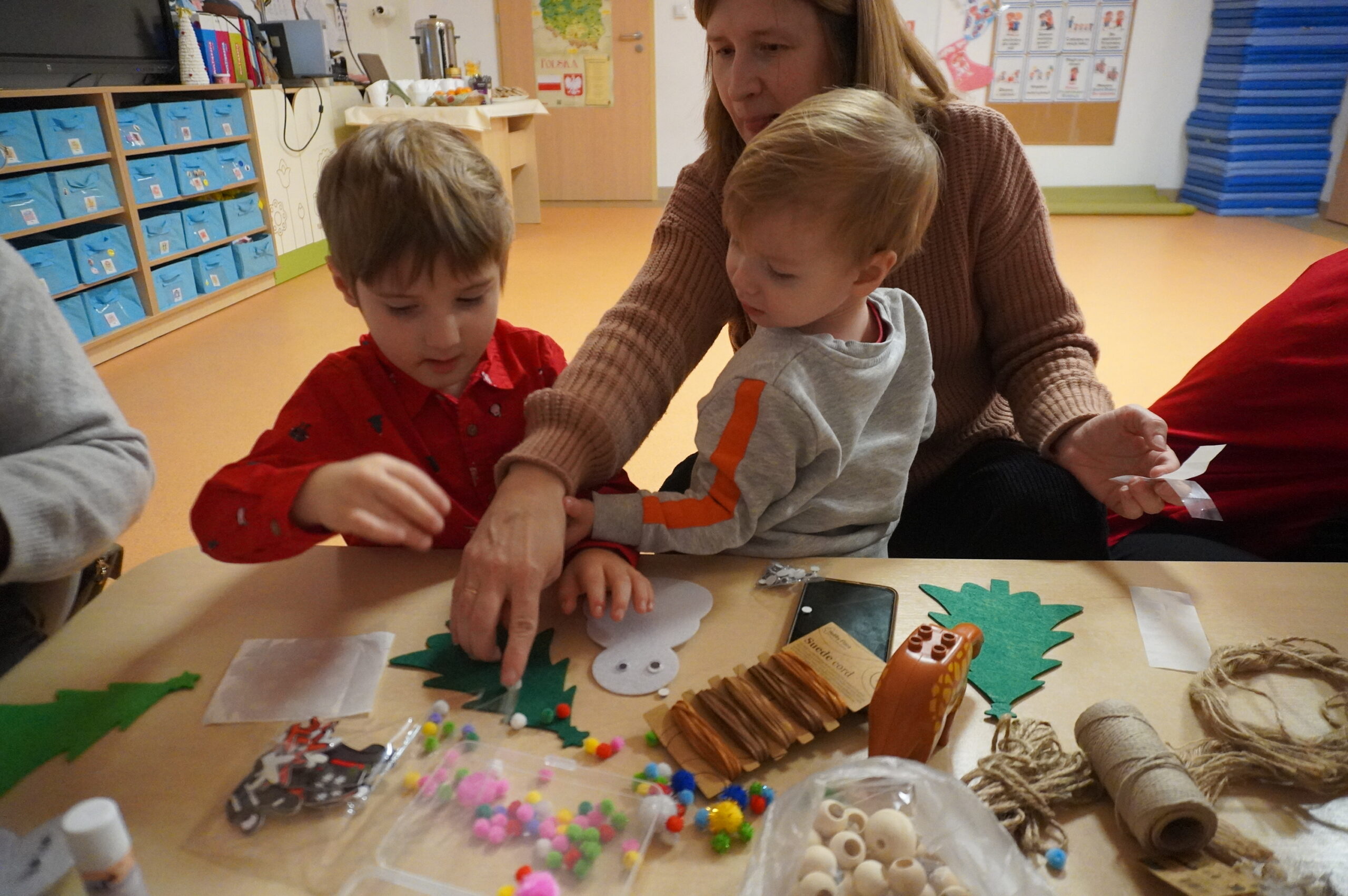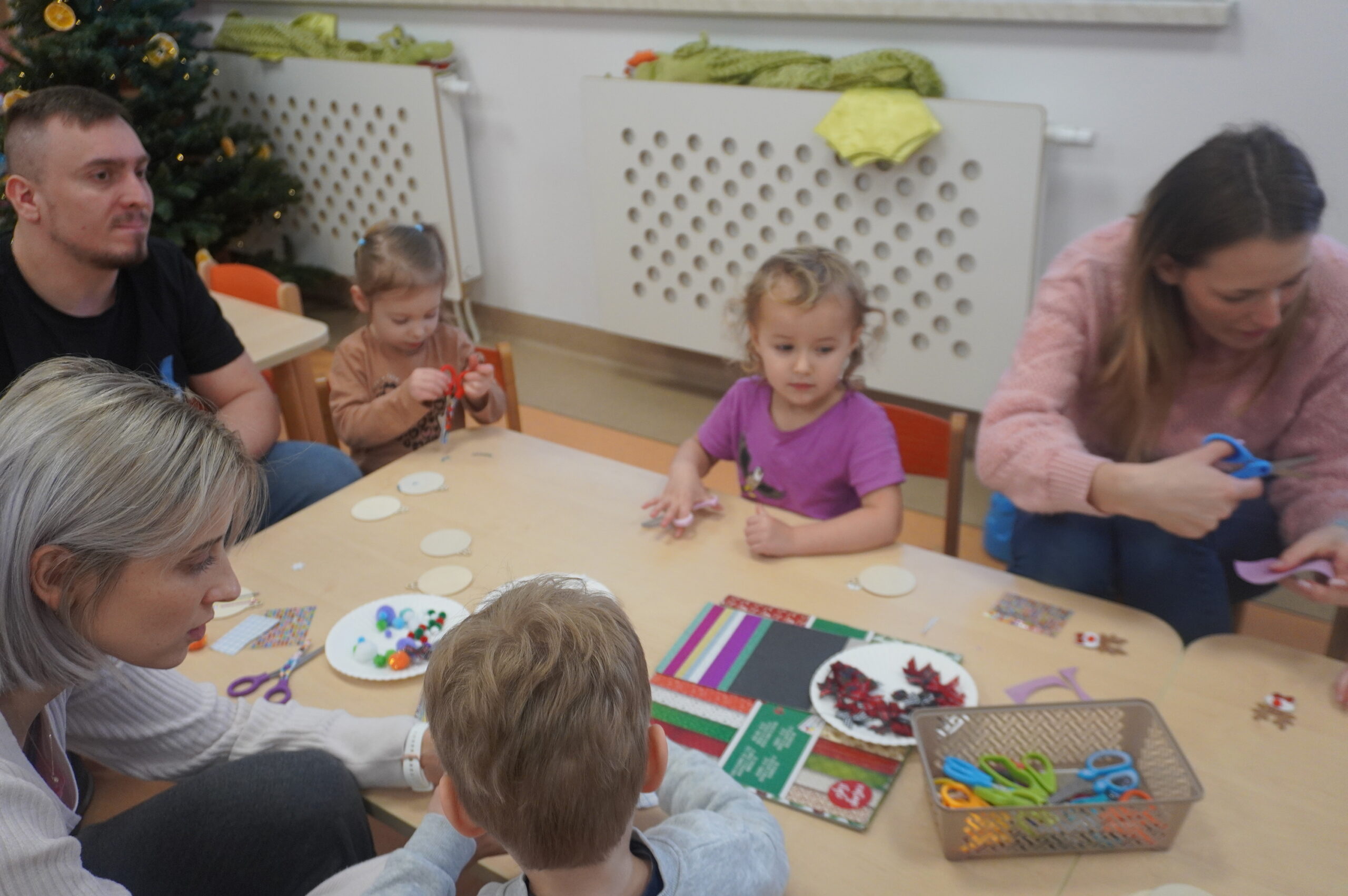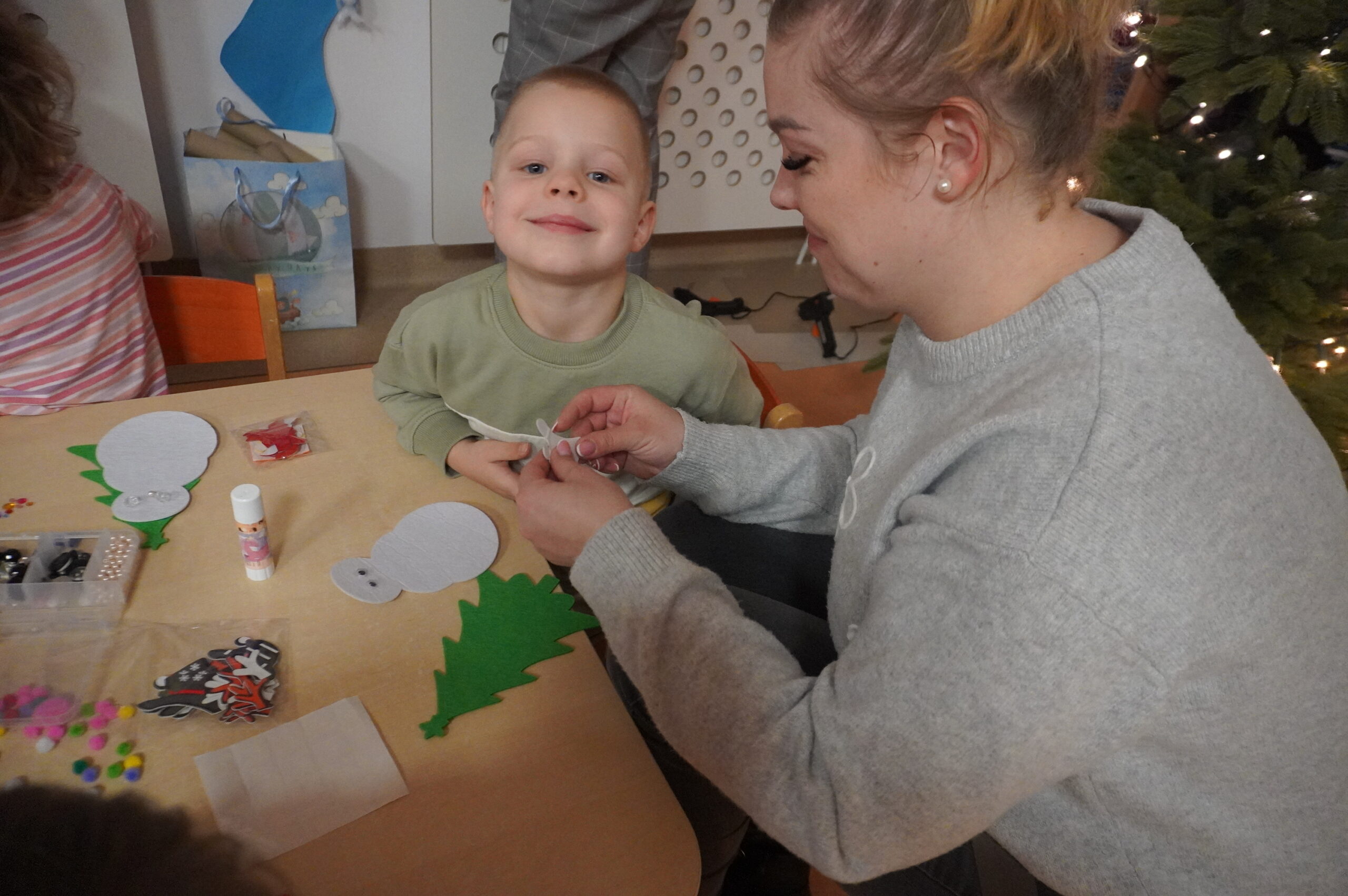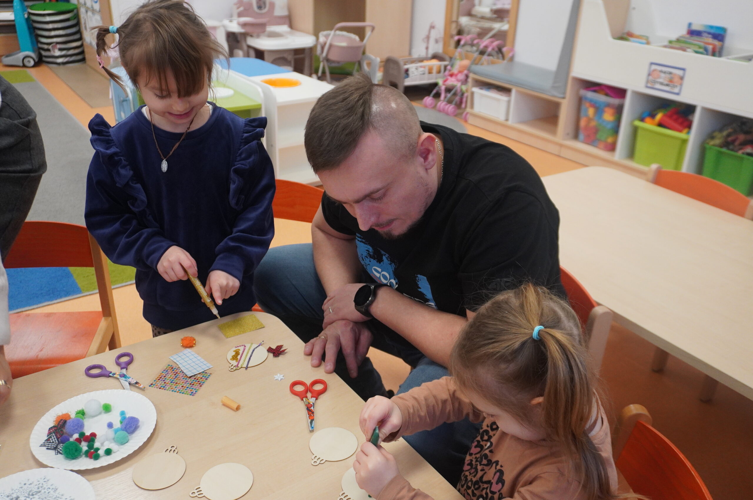 W grupach Owieczki oraz Iskierki odbyły się radosne warsztaty świąteczne z udziałem rodziców. Owieczki wspólnie z bliskimi tworzyły i ozdabiały drewniane bombki, wykorzystując różnorodne materiały dekoracyjne. Natomiast Iskierki rozpoczęły warsztaty krótkim występem artystycznym i również wykonały piękne ozdoby na choinkę. Na zakończenie wszyscy razem ubrali choinkę w sali, tworząc wyjątkową, świąteczną atmosferę pełną ciepła i radości.