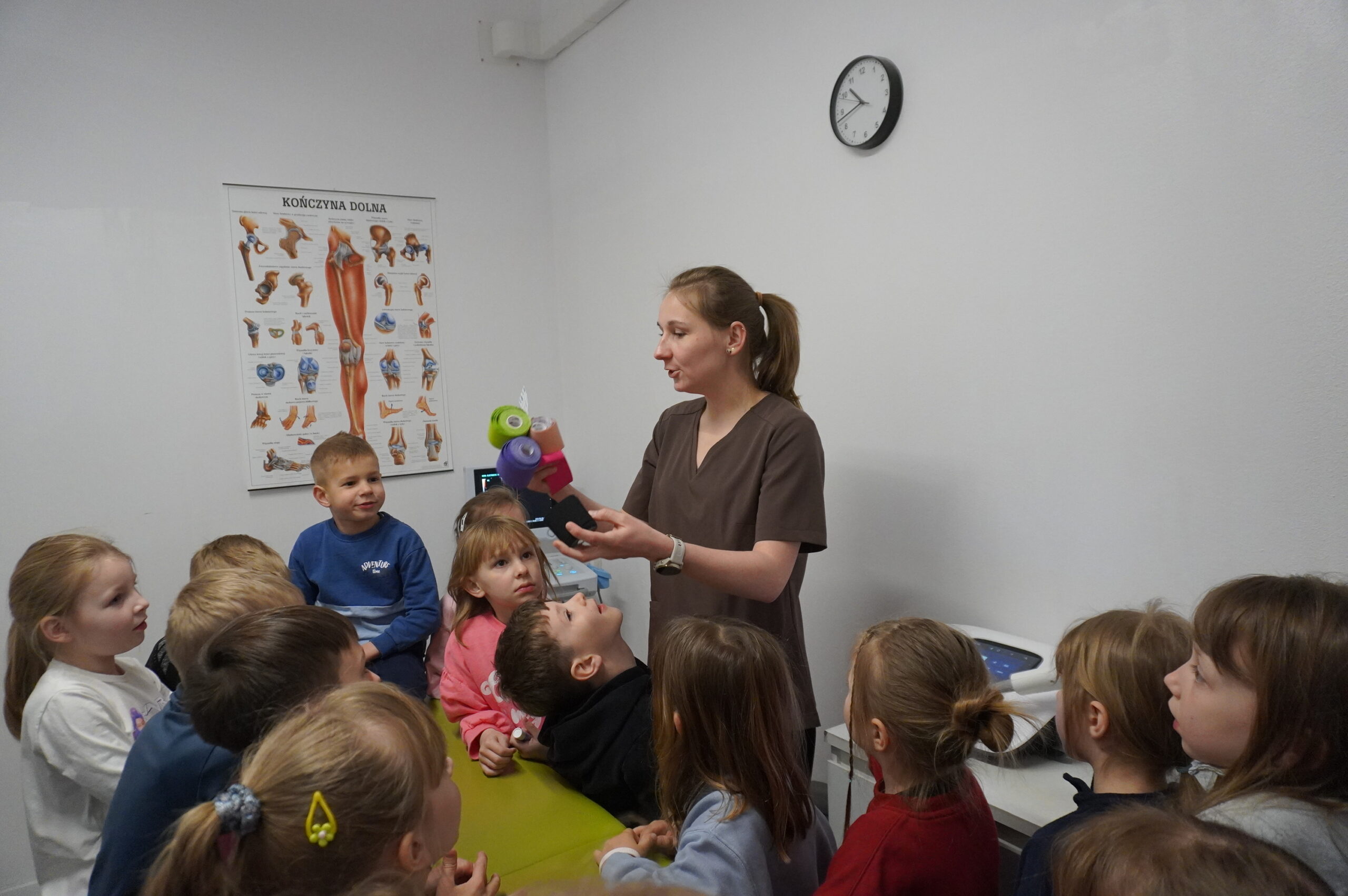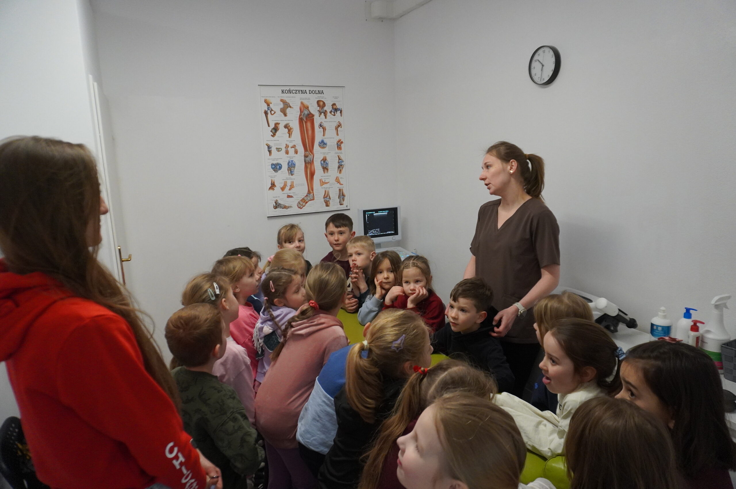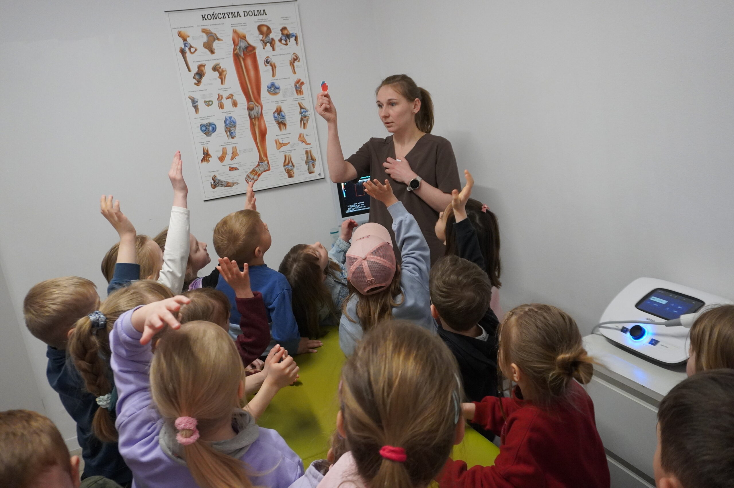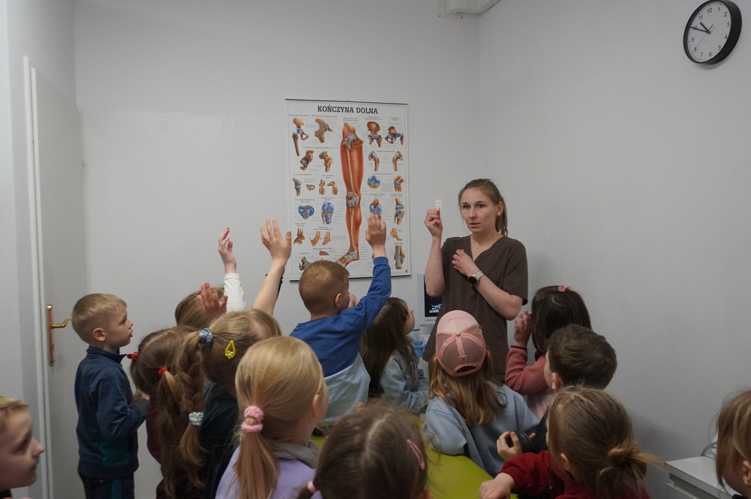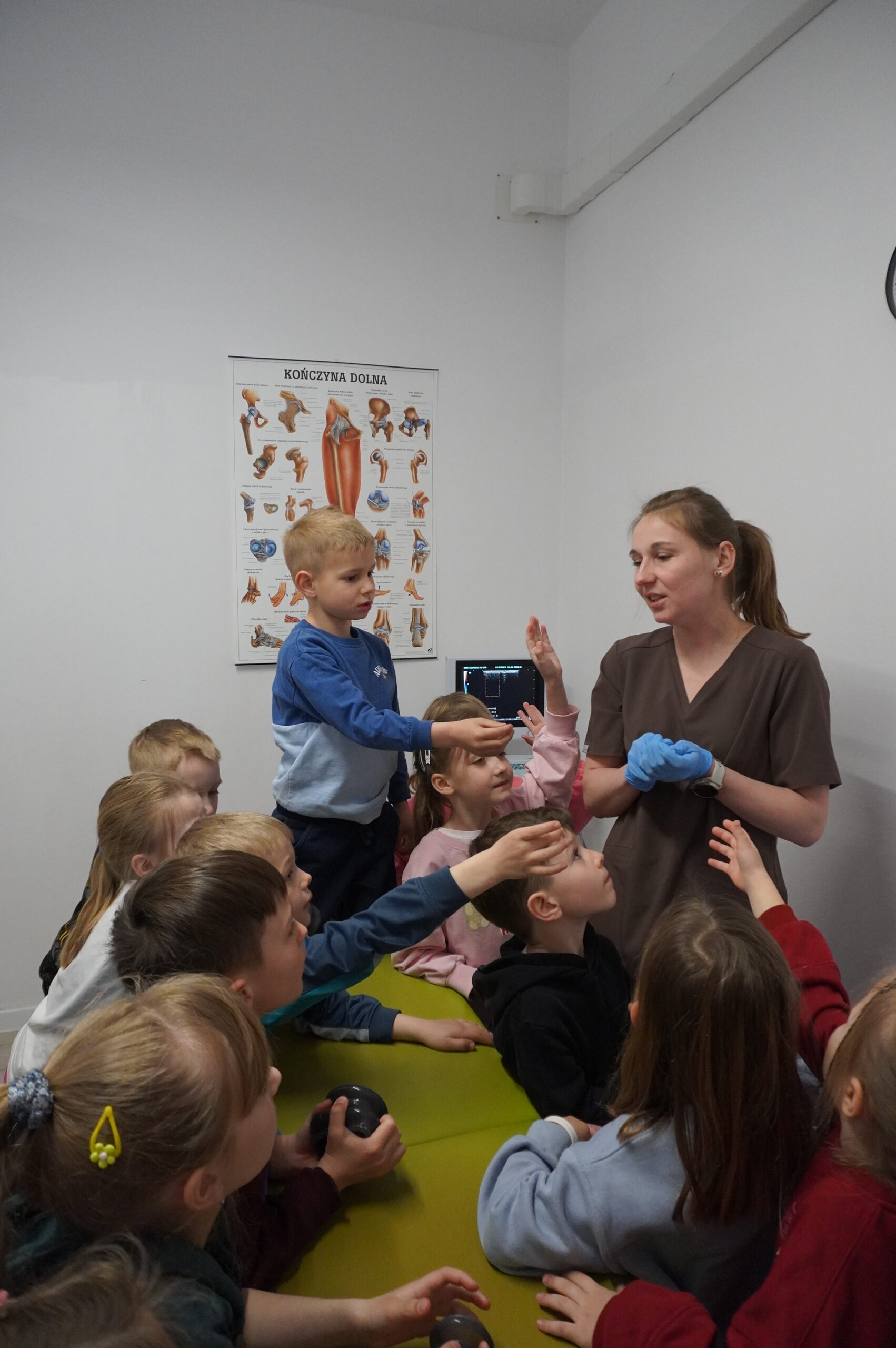 9 kwietnia przedszkolaki wybrały się na wycieczkę pieszą do gabinetu fizjoterapii. Celem wizyty było zapoznanie dzieci z zawodem fizjoterapeuty oraz kształtowanie nawyków dbania o zdrowie i prawidłową postawę ciała. Podczas spotkania Pani Paulina w ciekawy i dostosowany do wieku dzieci sposób opowiedziała o swojej pracy. Dzieci miały również okazję zobaczyć sprzęt wykorzystywany w gabinecie. Na koniec wizyty odbył się mały quiz. Dziękujemy Pani Paulinie!